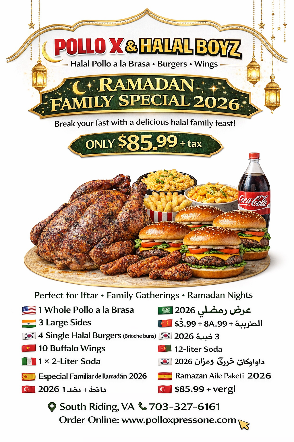 Burger Fusion Party Platter is built to feed a crowd. 🍔 8 Single Halal Burgers 🍗 25 Buffalo Wings 🍗 10 Tenders 🍟 2 Large Fries 🥗 4 Coleslaw 🥤 1 × 2-Liter Fanta 💥 $145.99 + tax