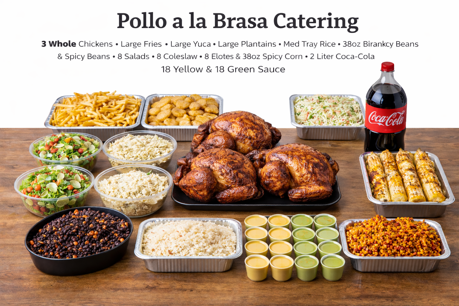 3 Whole Chickens,Larger Fries,Larger Yuca,Large Plantains, Med tray of Rice, 38oz Black beans & Spicy beans, 8 salads,8 coleslaw, 8 Elotes or 38oz Spicy Corn, & One 2 liters Drink,18 Yellow and 18 Green sauce