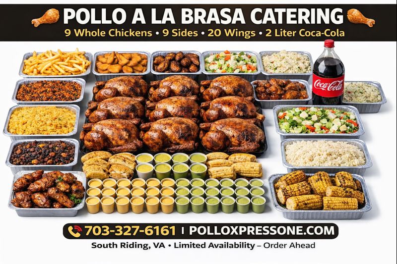 9 Whole Chickens,Med tray Fries,Med tray Yuca, Med tray Plantains, Med tray of Rice, Med tray Spicy Corn,Med tray Black beans & Spicy beans, large tray salads,Med tray coleslaw, 8 Elotes & One 2 liters Drink,48 Yellow and 48 Green sauce, 20 WIngs.